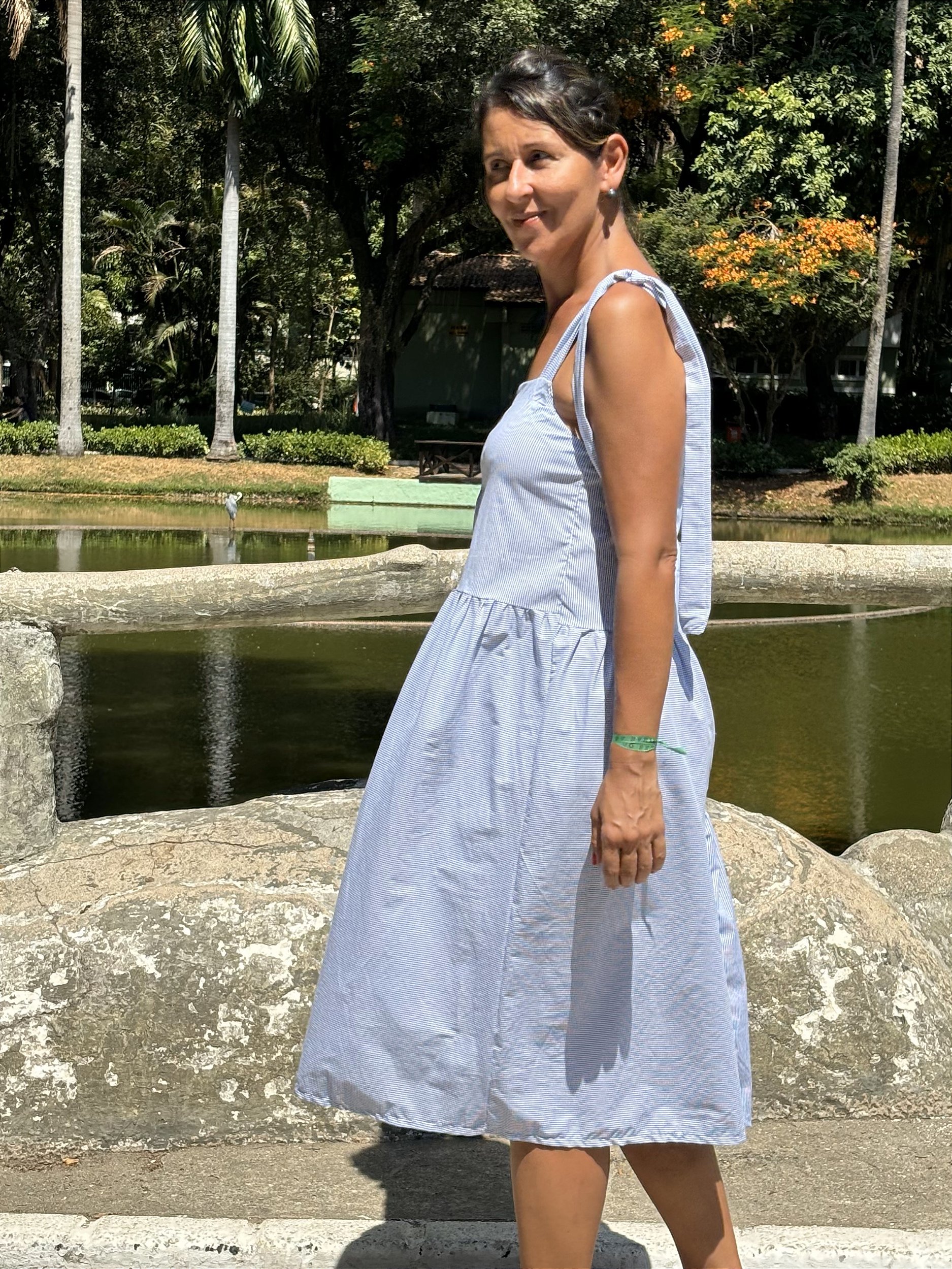 Lina é um vestido todo trabalhando na costura, Varias peças se unem para formar um mosaico de cor e estampa único.